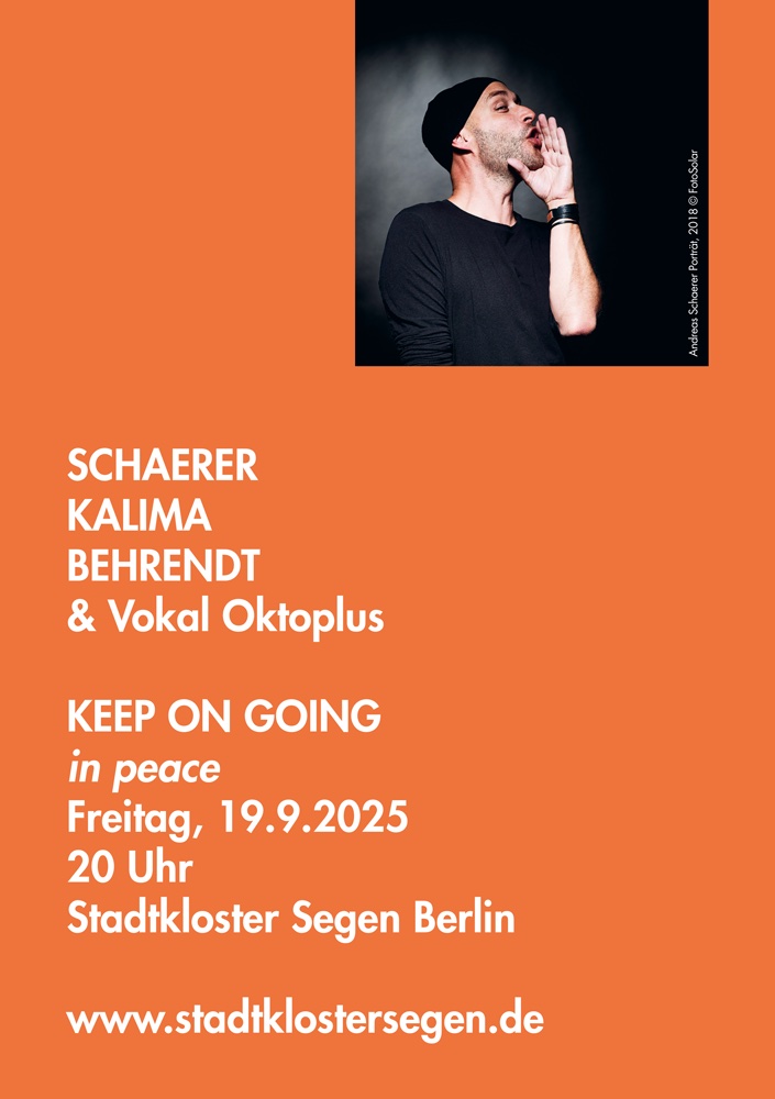 Unter dem Titel „KEEP ON GOING in peace“ findet am Freitag, 19. September 2025 ab 20 Uhr ein ungewöhnlich wie einzigartiges Dialog-Konzert für Stimmen, E-Gitarre und Orgel. Raumklang – wandelnde Klänge im Stadtkloster Segen im Prenzlauer Berg statt. Ein Klang- Dialog zwischen Improvisationen, Vokalmusik-Kompositionen, Jazz und NEUE Musik. Reise in eine wunderbare Klangwelt.