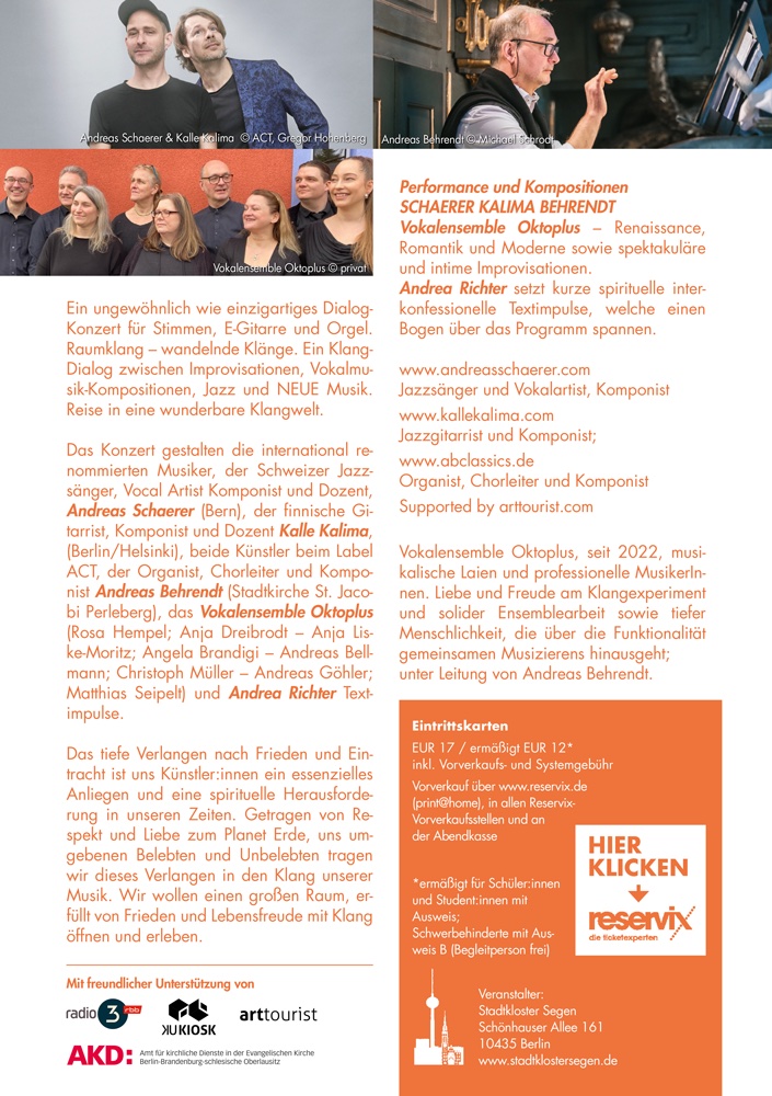 Das Konzert gestalten die international renommierten Musiker, der Schweizer Jazzsänger, Vocal Artist Komponist und Dozent, Andreas Schaerer (Bern), der finnische Gitarrist, Komponist und Dozent Kalle Kalima, (Berlin/Helsinki), beide Künstler beim Label ACT, der Organist, Chorleiter und Komponist Andreas Behrendt (Stadtkirche St. Jacobi Perleberg), das Vokalensemble Oktoplus (Rosa Hempel; Anja Dreibrodt – Anja Liske-Moritz; Angela Brandigi – Andreas Bellmann; Christoph Müller – Andreas Göhler; Matthias Seipelt) und Andrea Richter Textimpulse.