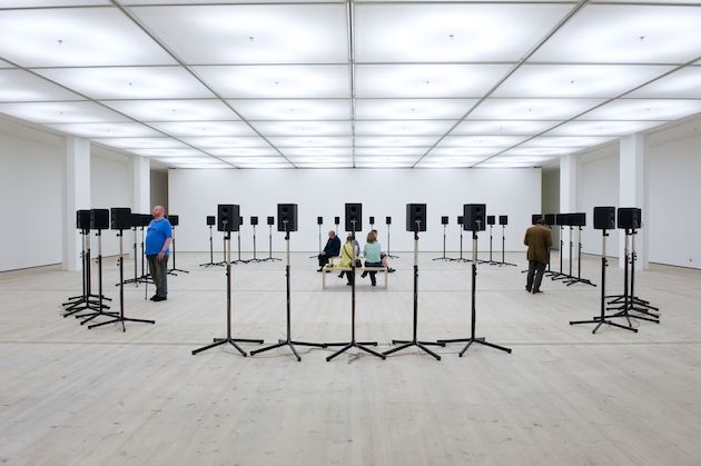 Die Sound-Installation The Forty Part Motet (2001) der kanadischen Künstlerin Janet Cardiff (*1957) rückt die skulpturalen Qualitäten von Klang in den Mittelpunkt und bietet ein einzigartiges räumliches Klangerlebnis. Ausgangspunkt bildet das polyphone Renaissance-Musikstück Spem in Alium, das Thomas Tallis um 1570 für acht Chöre zu je fünf Stimmen komponiert hat. Janet Cardiff zeichnete die Stimmen der Sänger:innen auf getrennten Tonspuren auf und lässt jede Stimme über einen der vierzig im Oval angeordneten Lautsprecher erklingen. Die eigene Bewegung im Raum bestimmt das Hörerlebnis und ermöglicht, sich sowohl auf die Intimität unterschiedlicher Solostimmen zu konzentrieren als auch in die suggestive raumreifende Komposition als Ganzes einzutauchen. Mit Dank an die Tate Modern, London.
