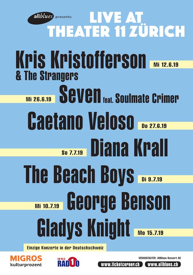 Nach begeisternden und restlos ausverkauften Konzerten mit David Byrne, Mariza, Dionne Warwick und der Tedeschi Trucks Band legt AllBlues mit einer exklusiven Sommerkonzertreihe im schönen Theater 11 in Zürich Oerlikon nach. Den Anfang macht am 12. Juni – exklusiv in der Schweiz – die Country-Folk-Ikone Kris Kristofferson, begleitet von der legendären ex-Merle-Haggard-Band „The Strangers“. Am 26. Juni ist SEVEN erstmals zu Gast im Theater 11, mit Popsänger Crimer als Duettgast auf Sevens Soulmate Tour. Tags darauf der vielleicht kreativste und einflussreichste Künstler der Música Popular Brasileira: Caetano Veloso gibt sich wieder einmal die Ehre in Zürich, auch er im einzigen Schweizer Konzert. Vom 7. bis 15. Juli geht’s Schlag auf Schlag: Zuerst Jazz-Superstar Diana Krall mit einer „Summernight full of Jazz“ und einer Band der Superlative inklusive Joe Lovano und Marc Ribot. Dann feiern die Beach Boys mit Originalsänger Mike Love „50 Years of Good Vibrations“ und George Benson spielt nicht nur alle seine Welthits wie „On Broadway“ und „Give Me The Night“, er hat auch ein neues Album im Gepäck: Eine Hommage an Chuck Berry und Fats Domino. Zum Schluss Gladys Knight, die „Empress of Soul“: Endlich kommt die siebenmalige Grammy-Gewinnerin für ein exklusives Konzert in die Schweiz. Eine großartige Frau und Sängerin im Zenit ihres Könnens.