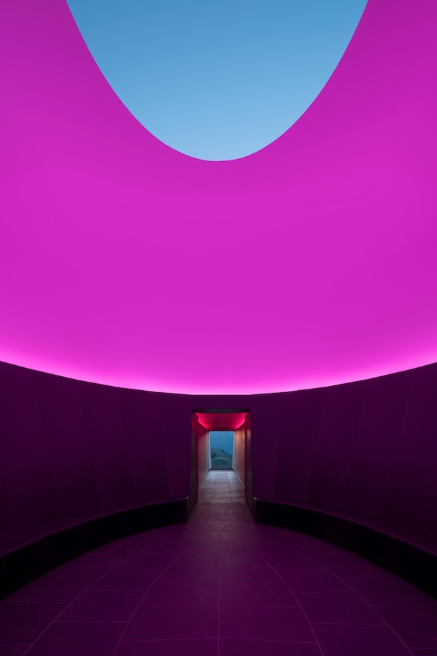 Bei Einbruch der Dämmerung werden im Skyspace-Lech Wände und Decke in farblich wechselndes Licht getaucht. Der Himmel wird durch die Öffnung als Teil des Raumes empfunden.