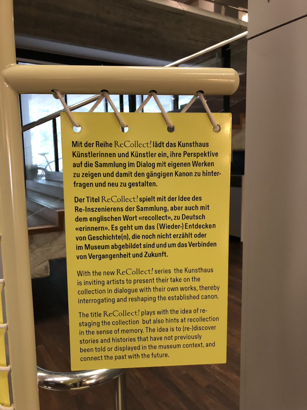 Die Ausstellung findet im ersten Stock des Müller-Baus statt, ein Bereich, der in den nächsten Jahren systematisch für Dialoge mit der Sammlung und Gegenwartskunst benutzt wird. Laib kennt die Sammlung des Kunsthauses seit seiner Kindheit – das Haus prägte ihn ebenso wie das Museum Rietberg, das er ebenfalls oft besucht hat. Im Sinne des Konzepts von «ReCollect!» ist Wolfgang Laib sowohl Künstler als auch Kurator und entwickelte die Ausstellung im Dialog mit Senior Curator Sammlung Philippe Büttner, der bereits 2005 eine grosse Retrospektive Laibs in der Fondation Beyeler kuratierte.